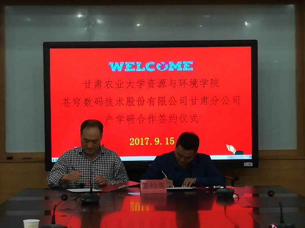 出席本次簽約儀式的有:甘肅農(nóng)業(yè)大學(xué)資源與環(huán)境學(xué)院院長劉學(xué)錄、書記蔡立群及學(xué)院老師和部分學(xué)生干部代表,蒼穹數(shù)碼技術(shù)股份有限公司甘肅分公司總經(jīng)理周建軍、技術(shù)總監(jiān)鄭嬌玉、項目管理部經(jīng)理王嬋、技術(shù)服務(wù)部經(jīng)理王繼娥。