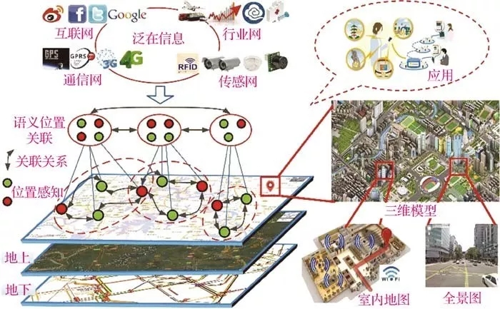 全息位置地圖實(shí)時(shí)或近實(shí)時(shí)地從互聯(lián)網(wǎng)、傳感網(wǎng)、通信網(wǎng)等構(gòu)成的泛在網(wǎng)中獲取泛在信息,這些獲取的信息通過語義位置在地圖上匯聚關(guān)聯(lián)。全息位置地圖的表現(xiàn)形式多樣,包含二維矢量、三維場景、全景圖、影像地圖等多種形式,并且實(shí)現(xiàn)室內(nèi)室外、地上地下一體化。圖1 顯示了全息位置地圖的概念示意圖。