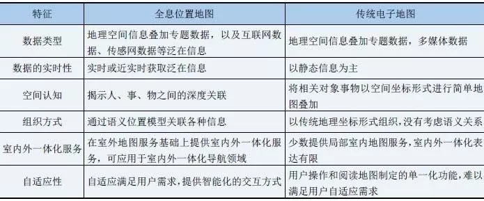 通過對(duì)全息位置地圖概念的理解,并與現(xiàn)有電子地圖比較分析(表1),歸納了全息位置地圖實(shí)時(shí)動(dòng)態(tài)性、語義位置關(guān)聯(lián)、室內(nèi)外一體化、自適應(yīng)性和多維時(shí)空表達(dá)的五大特征。