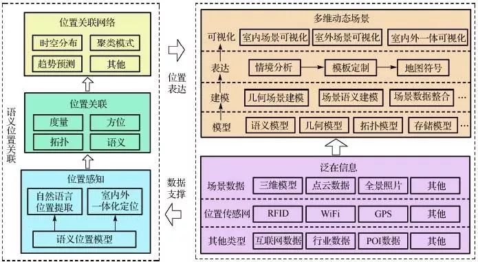 其中,語義位置關(guān)聯(lián)以語義位置模型(黃亮,2014)為基礎(chǔ),動(dòng)態(tài)感知泛在信息中存在的位置信息,并基于度量、方位、拓?fù)浜驼Z義等簡單的位置關(guān)聯(lián)和通過時(shí)空分布、聚類模型和趨勢(shì)預(yù)測(cè)等方法形成深層次的位置關(guān)聯(lián)網(wǎng)絡(luò),實(shí)現(xiàn)全方位的語義位置關(guān)聯(lián)。多維動(dòng)態(tài)場景的技術(shù)框架則分別從場景模型、建模、表達(dá)與可視化幾個(gè)方面構(gòu)建。