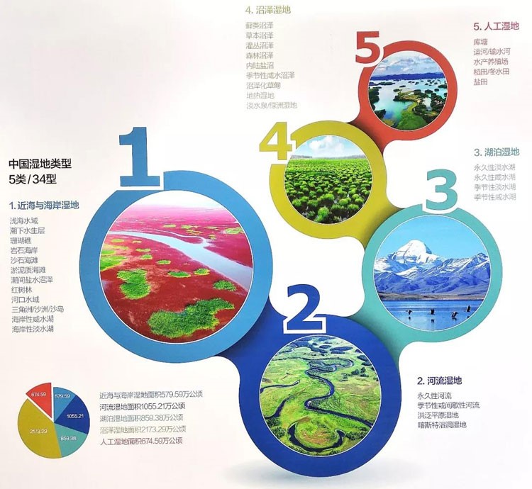 中國(guó)濕地類(lèi)型分為5類(lèi),34型,包括: