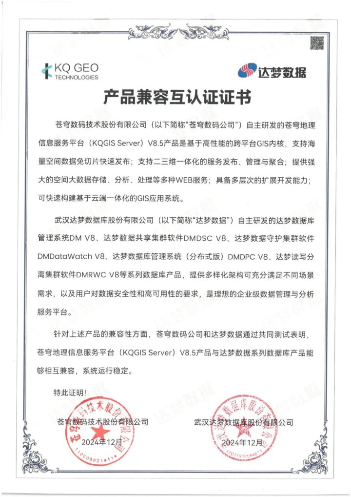 數(shù)據(jù)安全始終是客戶最關心的問題之一。KQGIS和DM都是數(shù)據(jù)的重要載體,通過蒼穹自主研發(fā)的GIS系統(tǒng)與國產化達夢數(shù)據(jù)庫完成兼容認證,實現(xiàn)雙方平臺的深度融合,蒼穹數(shù)碼能打造出更加高效、安全可控的數(shù)字底座,讓客戶的業(yè)務系統(tǒng)具備更高的可用性和可拓展能力,助力企業(yè)進行供應鏈數(shù)字化轉型,邁入數(shù)智化發(fā)展的新階段。