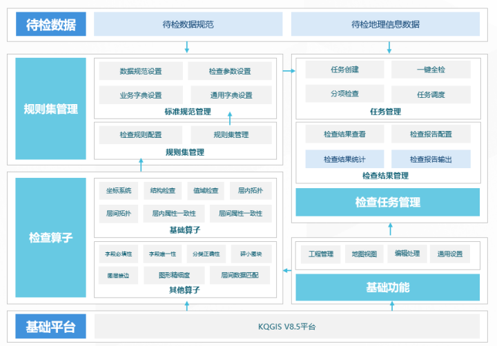 蒼穹地理信息數(shù)據(jù)質(zhì)量檢查系統(tǒng)基于KQGIS平臺(tái)自主研發(fā),旨在對(duì)各類(lèi)二三維地理信息數(shù)據(jù)進(jìn)行高效準(zhǔn)確的質(zhì)檢。基于不斷跟進(jìn)二調(diào)、三調(diào)和持續(xù)十多年的變更調(diào)查服務(wù),以及持續(xù)支撐國(guó)土空間規(guī)劃、實(shí)景三維等強(qiáng)GIS應(yīng)用,積累形成豐富的空間、屬性檢查算子,面向各類(lèi)地理信息數(shù)據(jù)規(guī)范化質(zhì)量檢查要求,實(shí)現(xiàn)基于算子的檢查規(guī)則靈活配置與規(guī)則集構(gòu)建管理,對(duì)二三維地理信息數(shù)據(jù)進(jìn)行高效檢查和結(jié)果輸出。