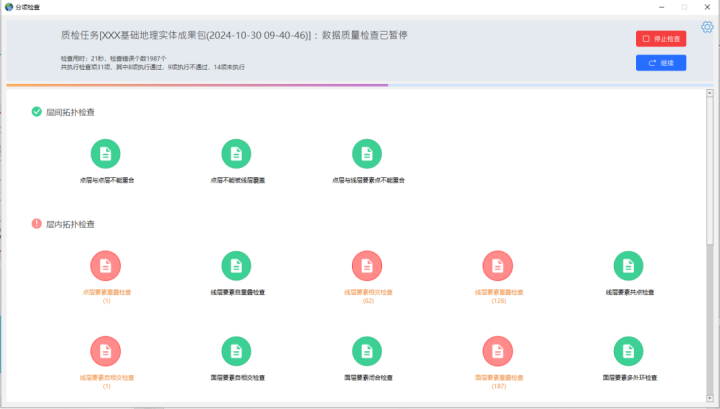 系統(tǒng)提供交互式質(zhì)檢能力,賦予用戶(hù)更加直觀、高效的質(zhì)檢體驗(yàn),支持對(duì)質(zhì)檢全過(guò)程的監(jiān)控與調(diào)度,允許用戶(hù)在質(zhì)檢進(jìn)行中隨時(shí)暫?;蛑貑ⅲ磿r(shí)查看當(dāng)前的質(zhì)檢情況,確保隨控隨檢、無(wú)遺漏。同時(shí)采用圖屬聯(lián)動(dòng)的方式,對(duì)質(zhì)檢結(jié)果進(jìn)行可視化定位以及以質(zhì)檢報(bào)告形式導(dǎo)出,實(shí)現(xiàn)質(zhì)檢全流程數(shù)據(jù)的可回溯。
