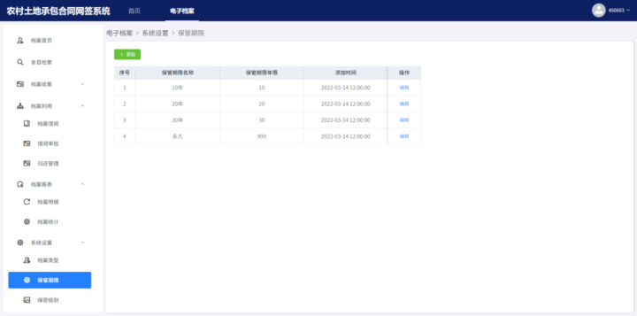 基于《二輪延包檔案管理辦法》,系統(tǒng)智能設(shè)置檔案類型、檔案保管期限、密級和材料歸檔內(nèi)容范圍,讓檔案的“生命周期”管理更加科學(xué)。同時(shí)系統(tǒng)支持手動(dòng)或自動(dòng)鑒定到期檔案,進(jìn)行延期或銷毀處理,確保檔案管理的規(guī)范性與安全性。