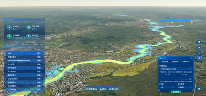 融合水文水動(dòng)力專業(yè)模型,預(yù)演洪水演進(jìn)過程,智能分析淹沒范圍內(nèi)受災(zāi)狀況,助力優(yōu)化防洪應(yīng)急調(diào)度方案,提升智能調(diào)度能力。