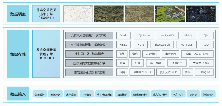 隨著空間數(shù)據(jù)獲取技術(shù)的發(fā)展,新時(shí)期地理信息數(shù)據(jù)呈現(xiàn)出種類多、體量大、更新快的特性。為了滿足用戶對(duì)海量空間數(shù)據(jù)的統(tǒng)一存儲(chǔ)和高效管理的需求,KQGIS研制出全空間數(shù)據(jù)管理引擎技術(shù),包含空間數(shù)據(jù)管理引擎、空間數(shù)據(jù)渲染引擎、空間數(shù)據(jù)分析引擎等內(nèi)容。