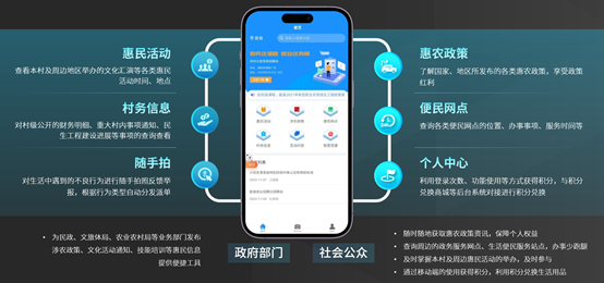 4、“便民化”服務(wù)直達:平臺延伸至移動端,為村民提供政策咨詢、辦事指南、問題上報、村務(wù)公開等便捷服務(wù)通道,有效拉近了干群距離,提升了村民的參與感和獲得感,讓數(shù)字紅利真正惠及千家萬戶。