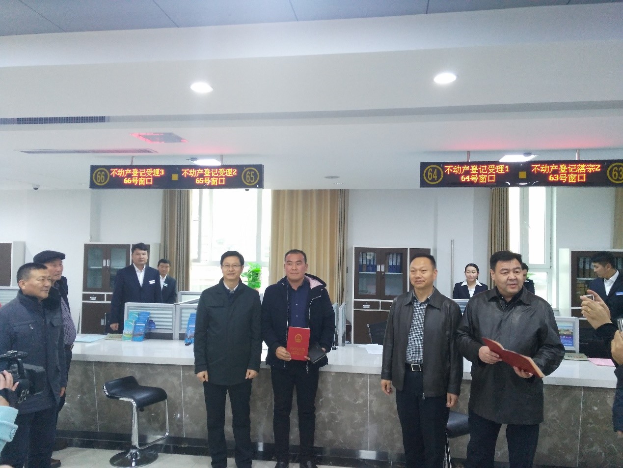 11月16日,新疆精河縣不動(dòng)產(chǎn)登記局(中心)揭牌儀式暨首證頒發(fā)儀式在精河縣不動(dòng)產(chǎn)登記中心舉行。出席儀式的有博州人民政府副秘書長(zhǎng)武清杰、博州國(guó)土資源局局長(zhǎng)庫(kù)沙英·阿斯拜克、精河縣委常委劉光勇、博州不動(dòng)產(chǎn)登記中心主任盧新安、博州不動(dòng)產(chǎn)登記中心副主任塔依爾、博州國(guó)土資源局地籍科科長(zhǎng)范嚴(yán)生。