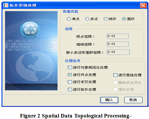 Processing the data in batch or in interactive method according to the detected error types; powerful data topological processing function including basic graph processing, land features normalization processing, path arrangement, ring-on-ring processing, fixed zooming, redundancy disposal and topological consistency processing.
