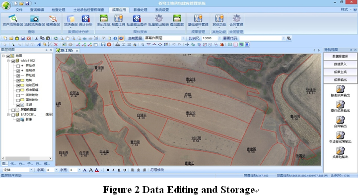 The system provides users with optional database building software based on ARCGIS or KQGIS platform. On the basis of rural land contract survey results, it provides users with functions including digitizing and transformation, spatial and ownership data organization, receiving and conversion, check and processing, database maintenance, maps, one-key output of tables, and data update, therefore completes the construction of rural contracted land management rights database.