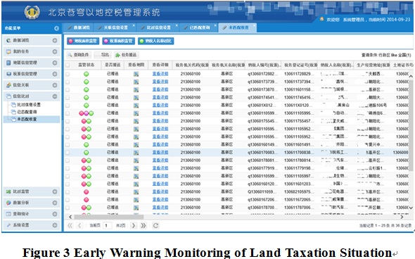 By conducting early warning analysis before the collection and management towards recruited land and exempt land as well as taxed and untaxed land, it realized whole-course early warning monitoring and ensured the quality and efficiency of collection and management towards urban land tax source.